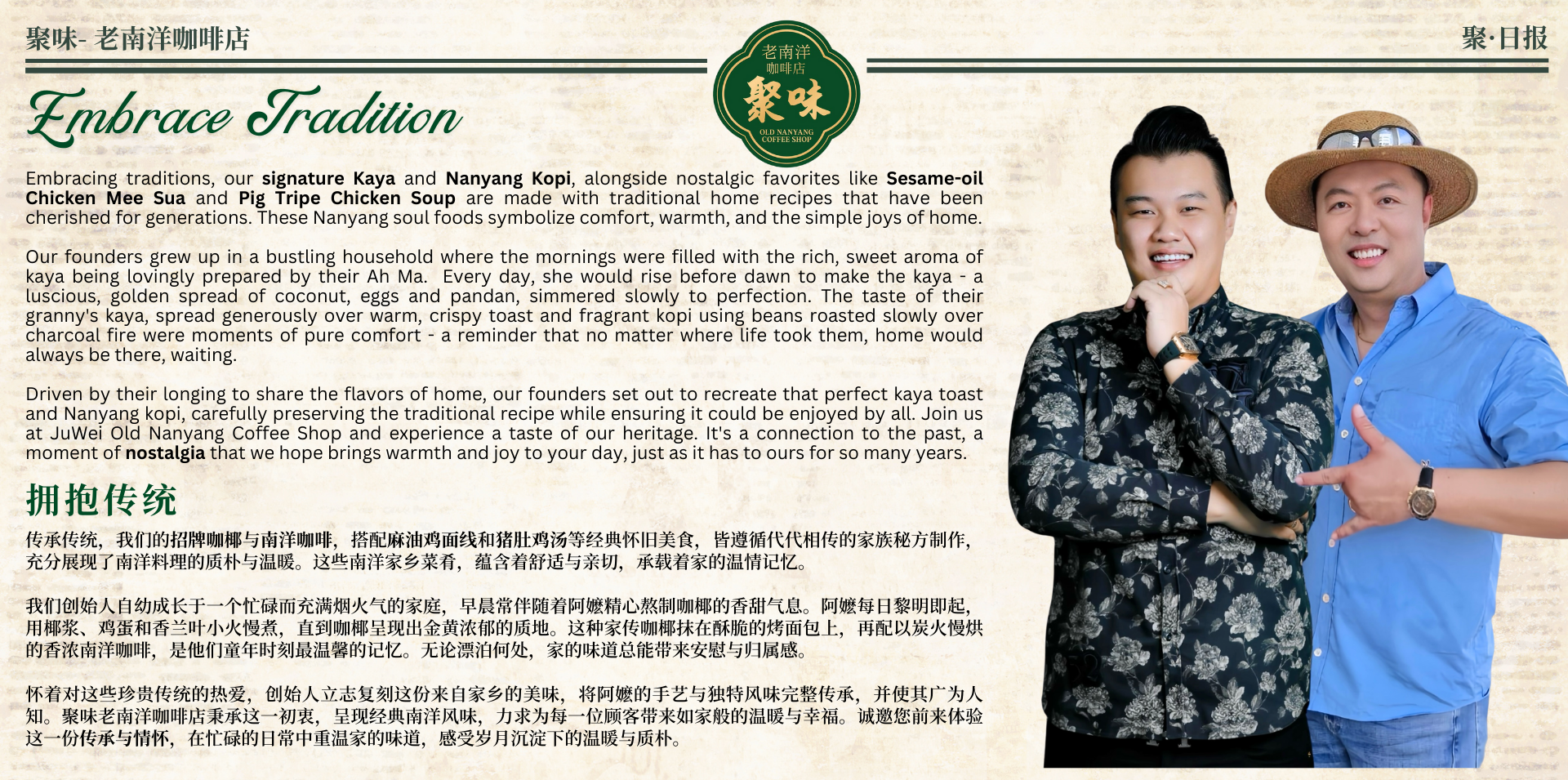 Located in Clarke Quay, 聚味老南洋 welcomes you to gather, celebrate, and enjoy the vibrant flavours of Nanyang cuisine. Whether you’re reminiscing the past, marking a new milestone, or simply enjoying a cup of traditional kopi, we’re here to celebrate the joy of coming together.